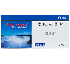 依托考昔是一种非甾体抗炎药,在动物模型中它具有抗炎、镇痛和解热作用。在临床剂量范围之内或以上,安康信是具有口服活性的,选择性环氧化酶-2抑制剂。目前已发现环氧化酶的两种亚型:环氧化酶-1(COX-1)和环氧化酶-2(COX-2)。COX-1参与胃粘膜细胞保护和血小板聚集等前列腺素介导的正常生理功能。非选择性非甾体抗炎药抑制了COX-1的产生,因此可引起胃粘膜损伤和血小板聚集作用减弱。COX-2主要参与炎性前列腺素的产生,引起疼痛、炎症和发热等。依托考昔是选择性的环氧化酶-2的抑制剂,可减轻这些症状和体征,降低胃肠道副作用且不影响血小板的功能。