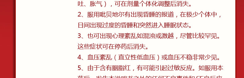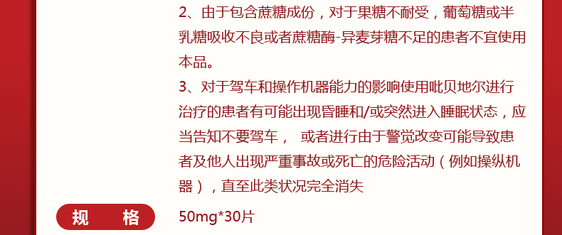 1.在使用吡贝地尔进行治疗的患者中有出现昏睡和突然进入睡眠状态的情况,特别是帕金森患者。在日常的活动中间突然入睡,没有前兆的情况罕有报道。有必要告知患者有此类副作用的可能,在服药治疗期间如果患者驾车或者是进行机器操作必须小心注意。曾加出现过昏睡或突然入睡的患者不可驾驶车辆或进行机器操作。应当考虑减少用药剂量和退出治疗。