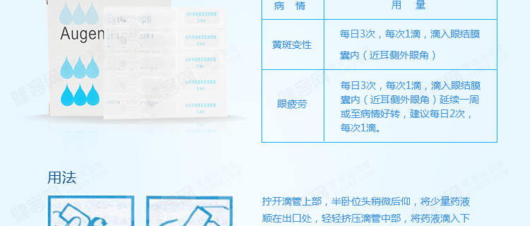 【用法用量】 黄斑变性:每日3次,每次1滴,滴入眼结膜囊内(近耳侧外眼角)。 眼 疲 劳:每日3次,每次1滴,滴入眼结膜囊内(近耳侧外眼角),延续一周或至病情好转,建议每日2次,每次1滴。