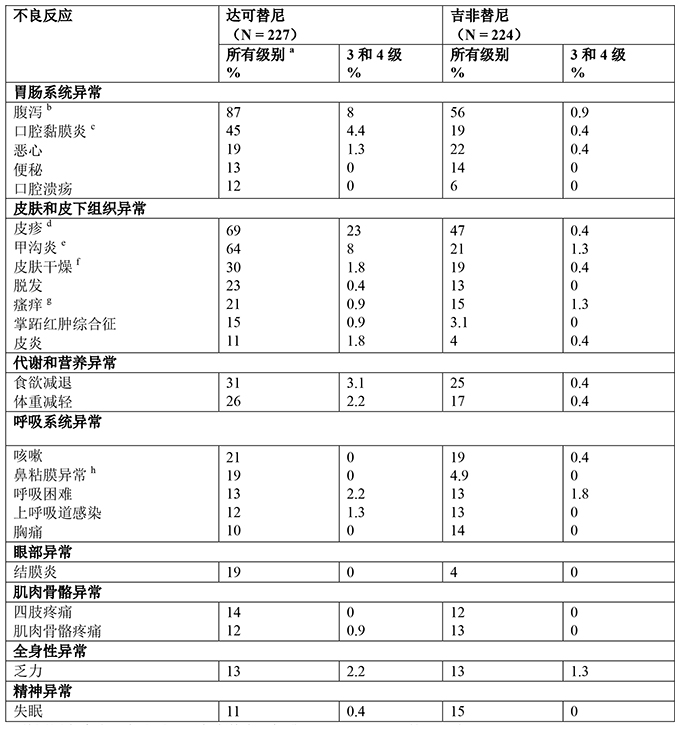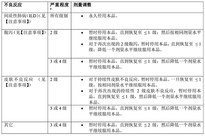 27%接受本品治疗的患者出现了严重不良反应。最常见(发生率≥1%)的严重不良反应有腹泻(2.2%)、间质性肺病(1.3%)。57%接受本品治疗的患者曾中断给药。导致给药中断的最常见(发生率>5%)不良反应有皮疹(23%)、甲沟炎(13%)和腹泻(10%)。66%接受本品治疗的患者曾降低剂量。导致剂量降低的最常见(发生率>5%)不良反应有皮疹(29%)、甲沟炎(17%)和腹泻(8%)。